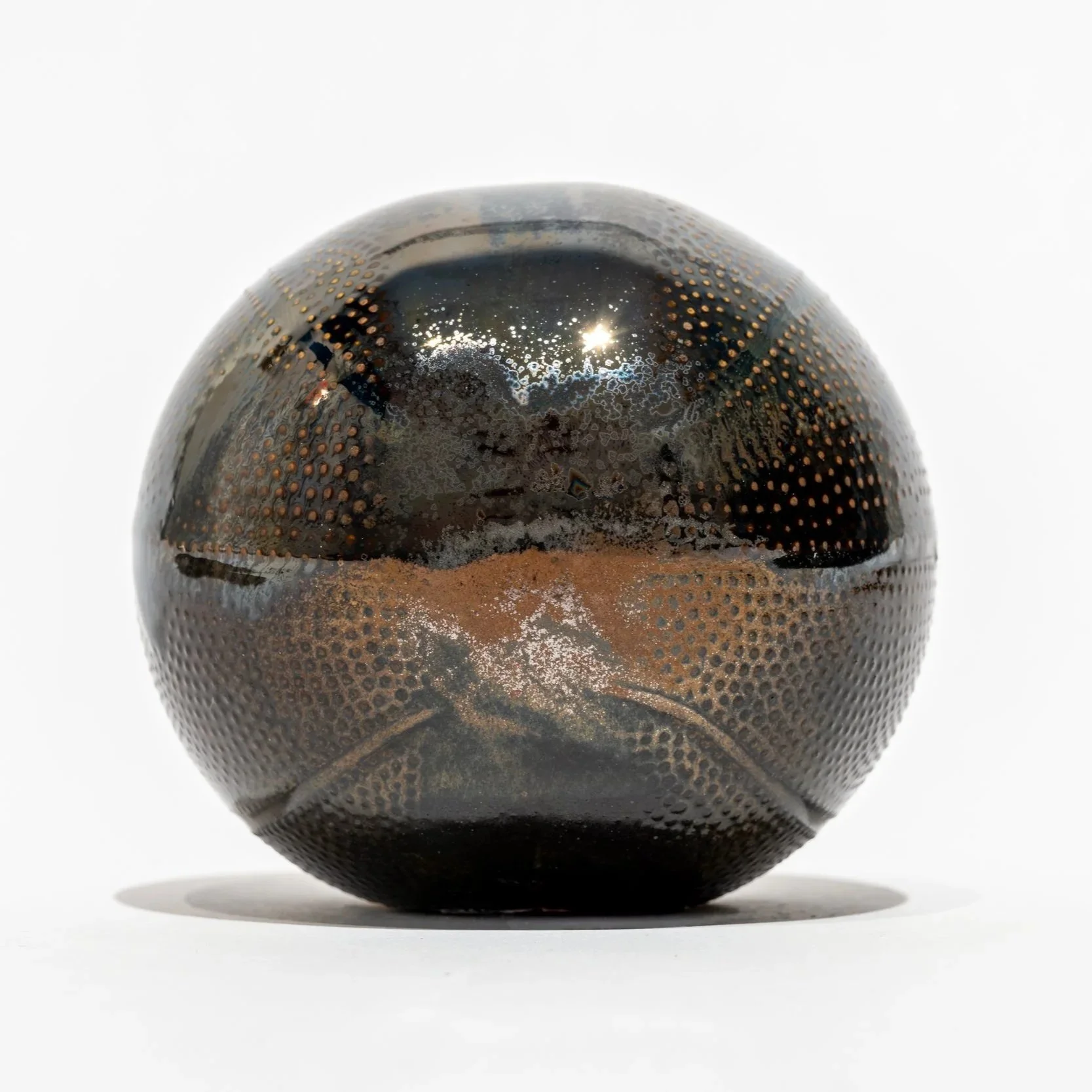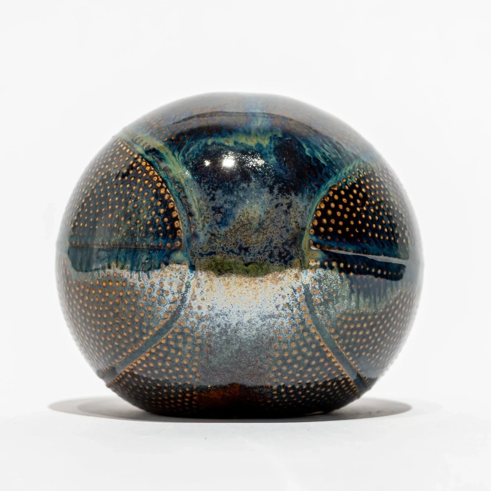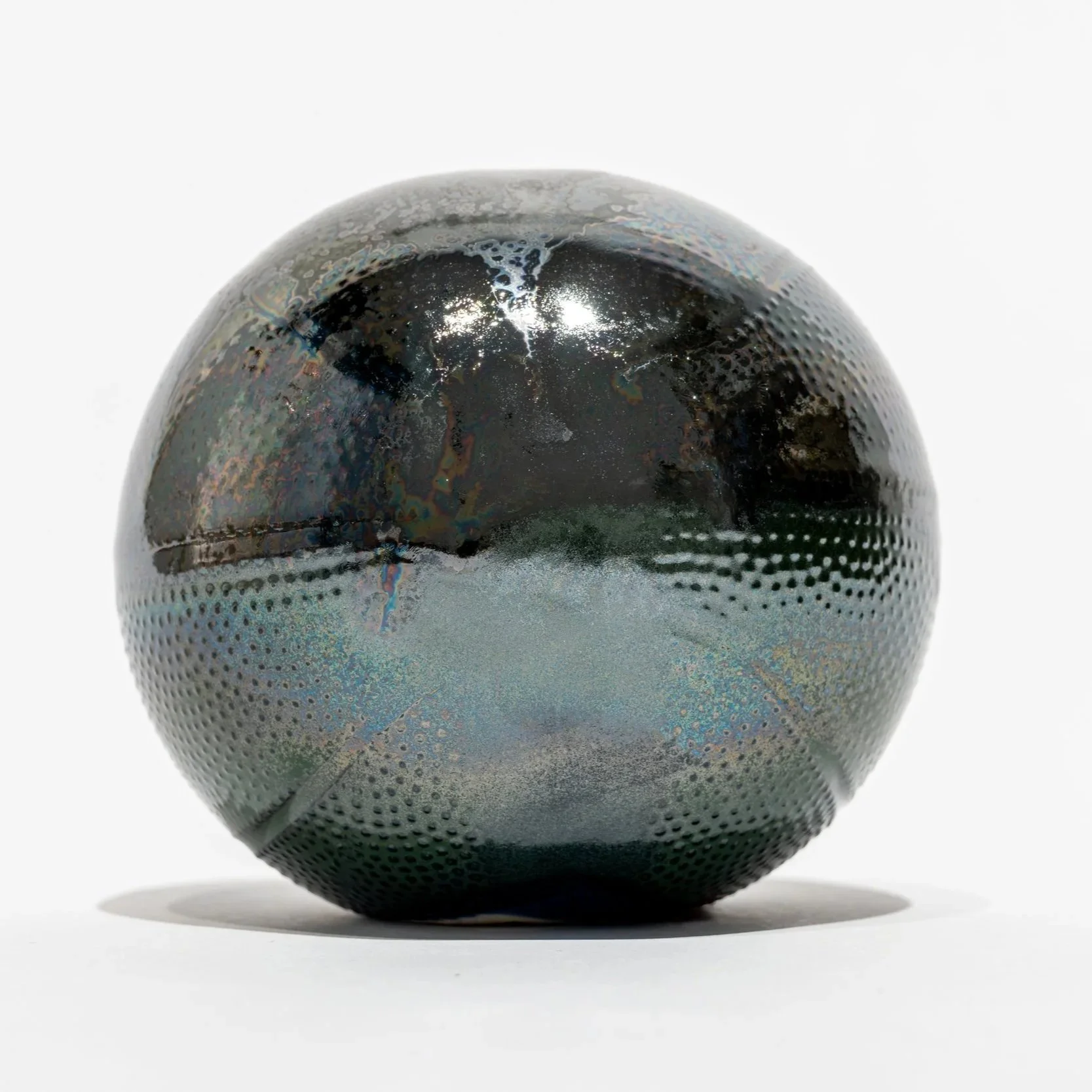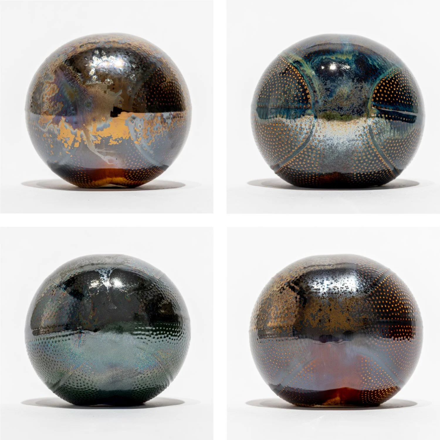 Flashback is a limited edition sculpture of thirty ceramic basketballs by Jairo Sosa, created as part of his solo exhibition at CUE, Boomerang. Cast and glazed in one of nine different metallic glaze combinations, each work in the edition carries subtle variations in surface finish and tone.
