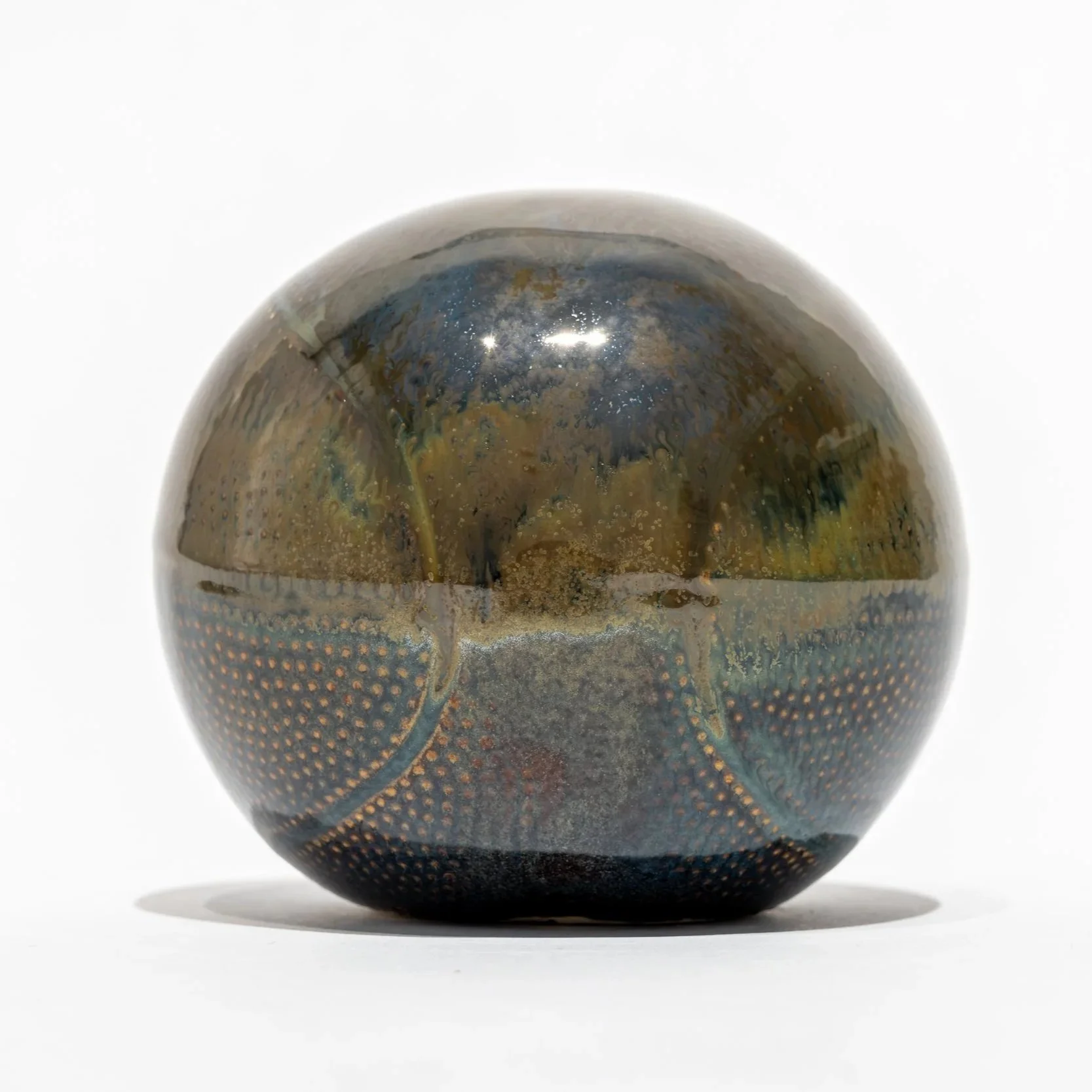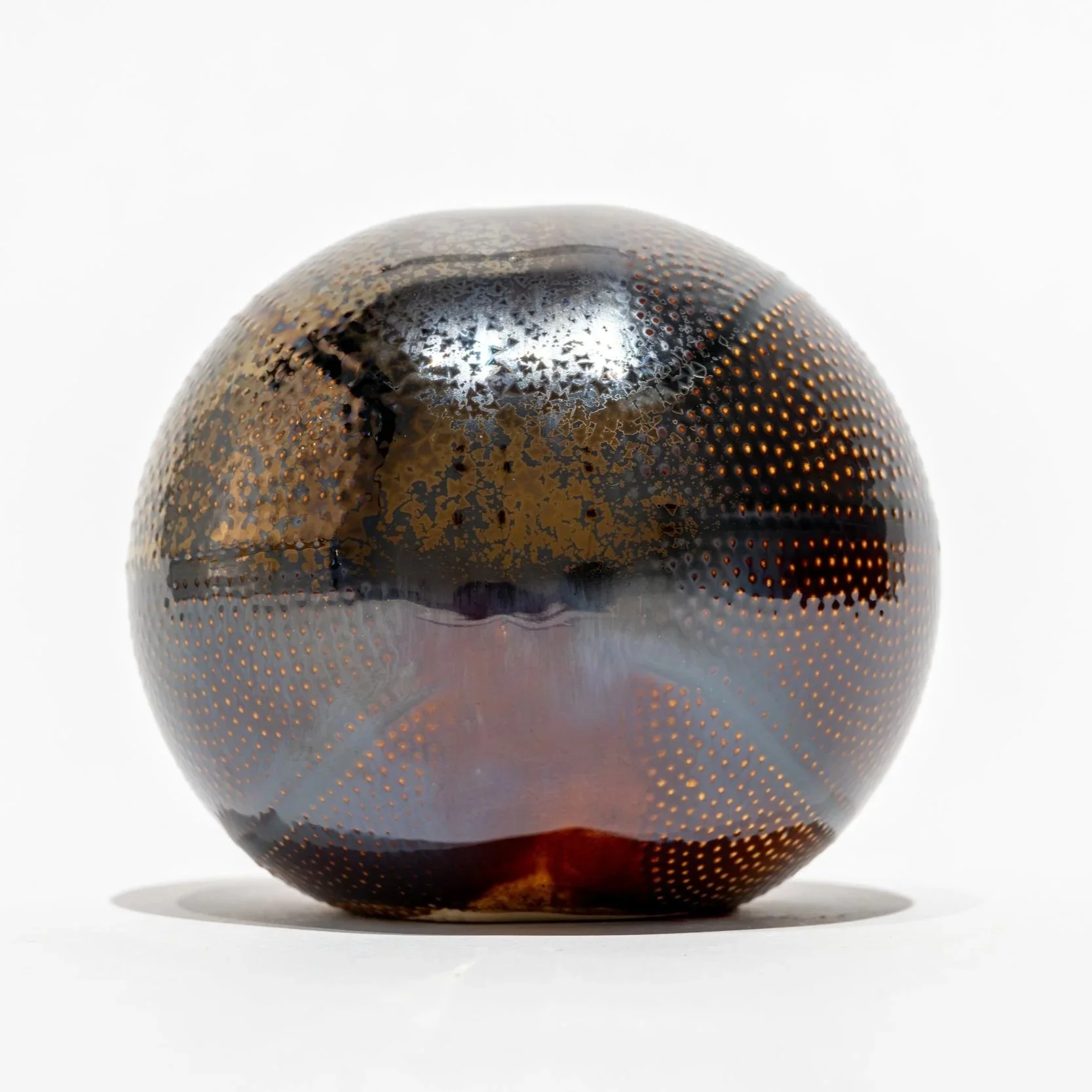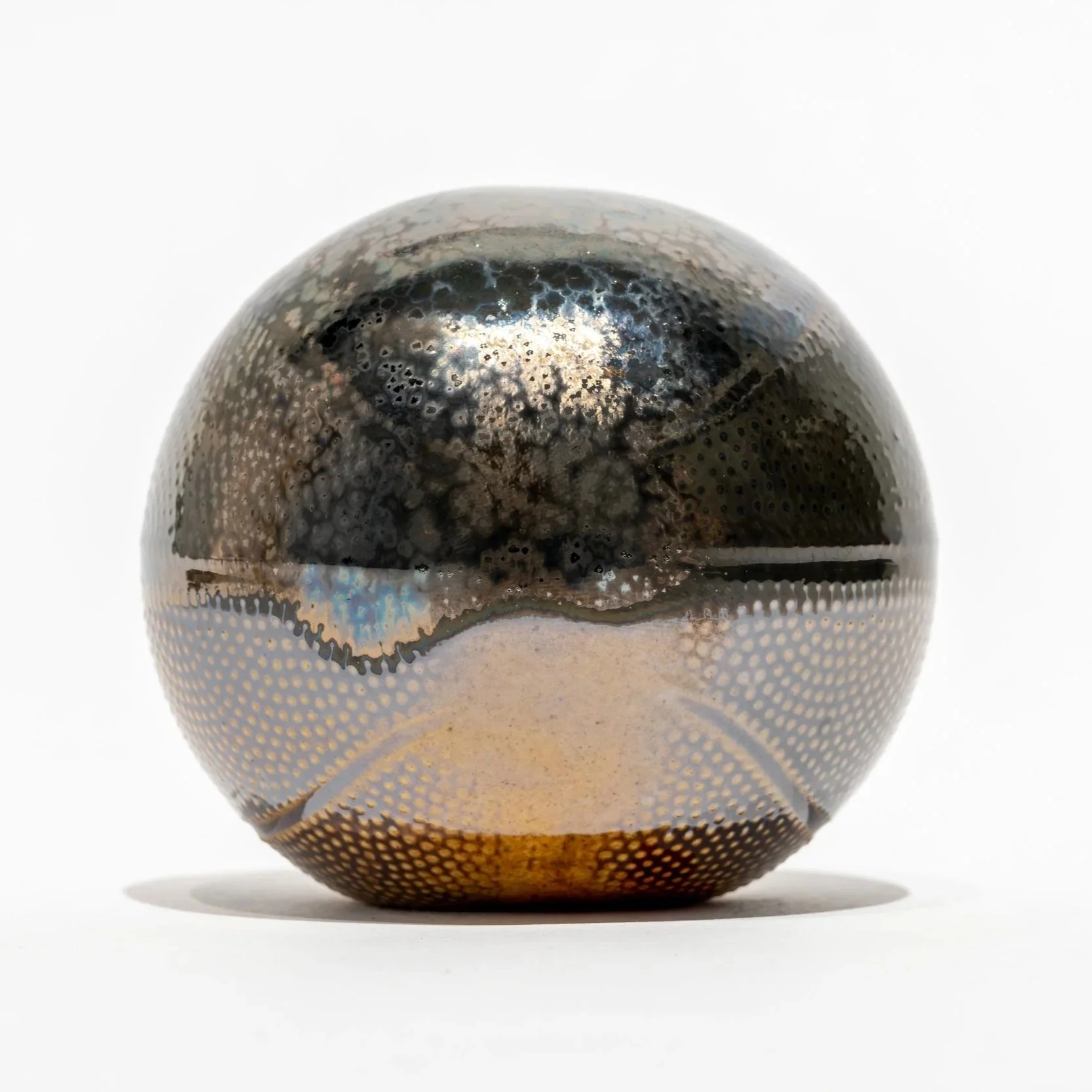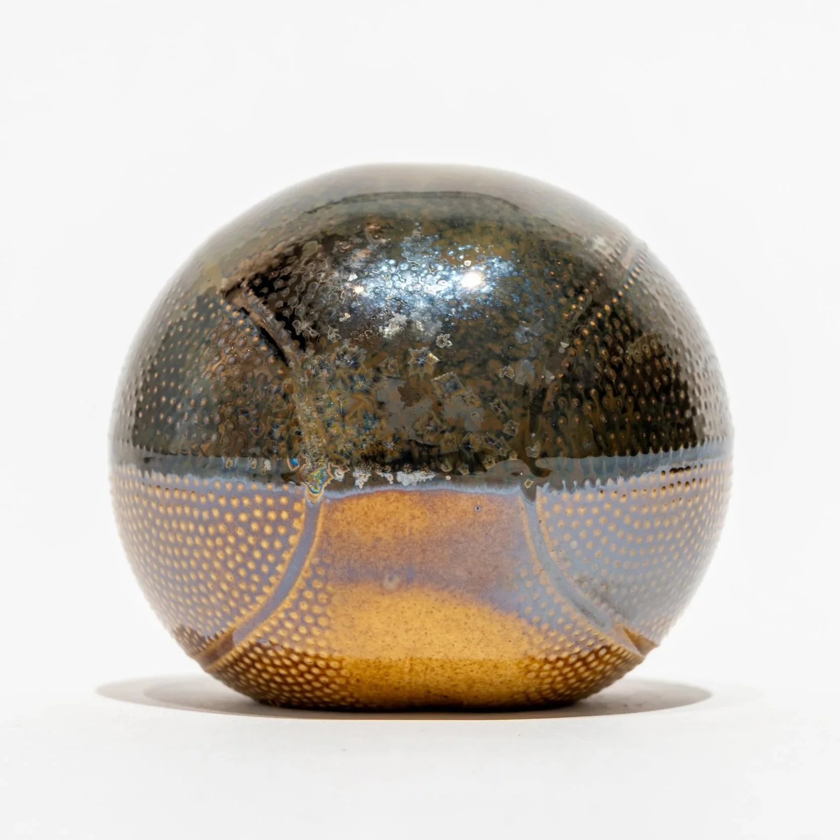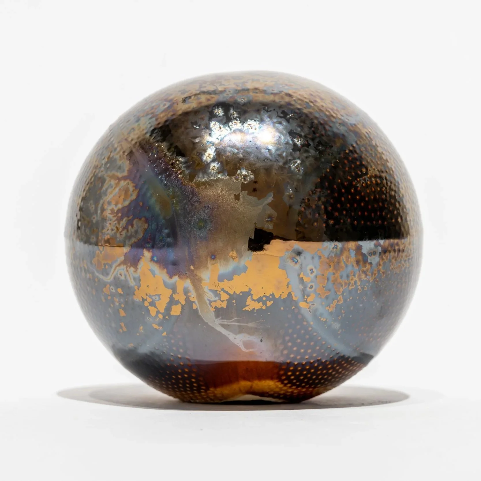 Flashback is a limited edition sculpture of thirty ceramic basketballs by Jairo Sosa, created as part of his solo exhibition at CUE, Boomerang. Cast and glazed in one of nine different metallic glaze combinations, each work in the edition carries subtle variations in surface finish and tone.