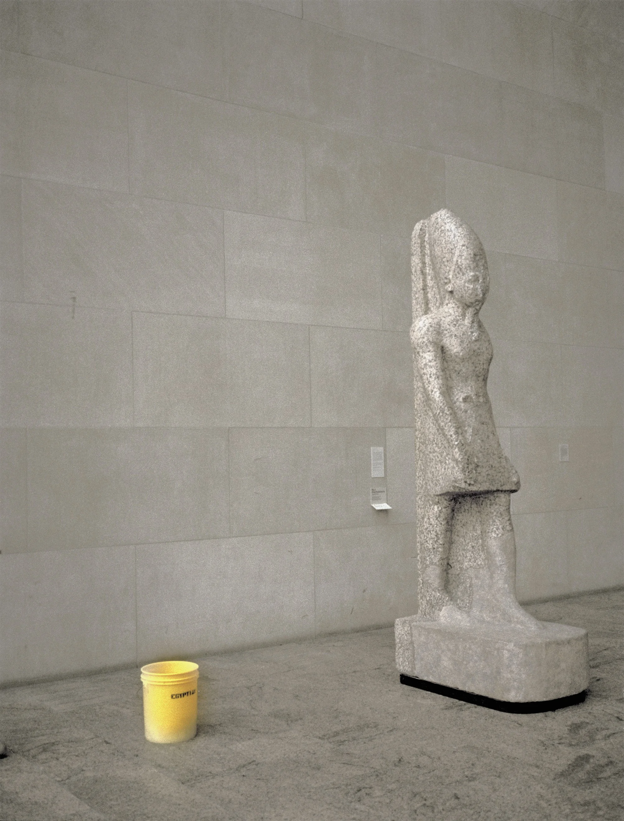 A photograph of an Ancient Egyptian statue with a yellow bucket proves this sameness with wonderful humor. The pocked grey stone of the statue, the mottled grey stone of the floor, and the pale grey stone of the wall form a material utopia—the statue’s stone as valuable as the floor and the wall. The yellow plastic bucket, at first, seems to trespass into this space, introducing color and kitsch. Despite the few thousand years between the making of the statue and the bucket, the stability of the bucket’s design and use points to a different type of longevity. The bucket will never turn to dust. Where the statue is relegated to the museum, the bucket still functions. The democratization of these components proposes equality. As Linn says, “A nice make-believe world.”