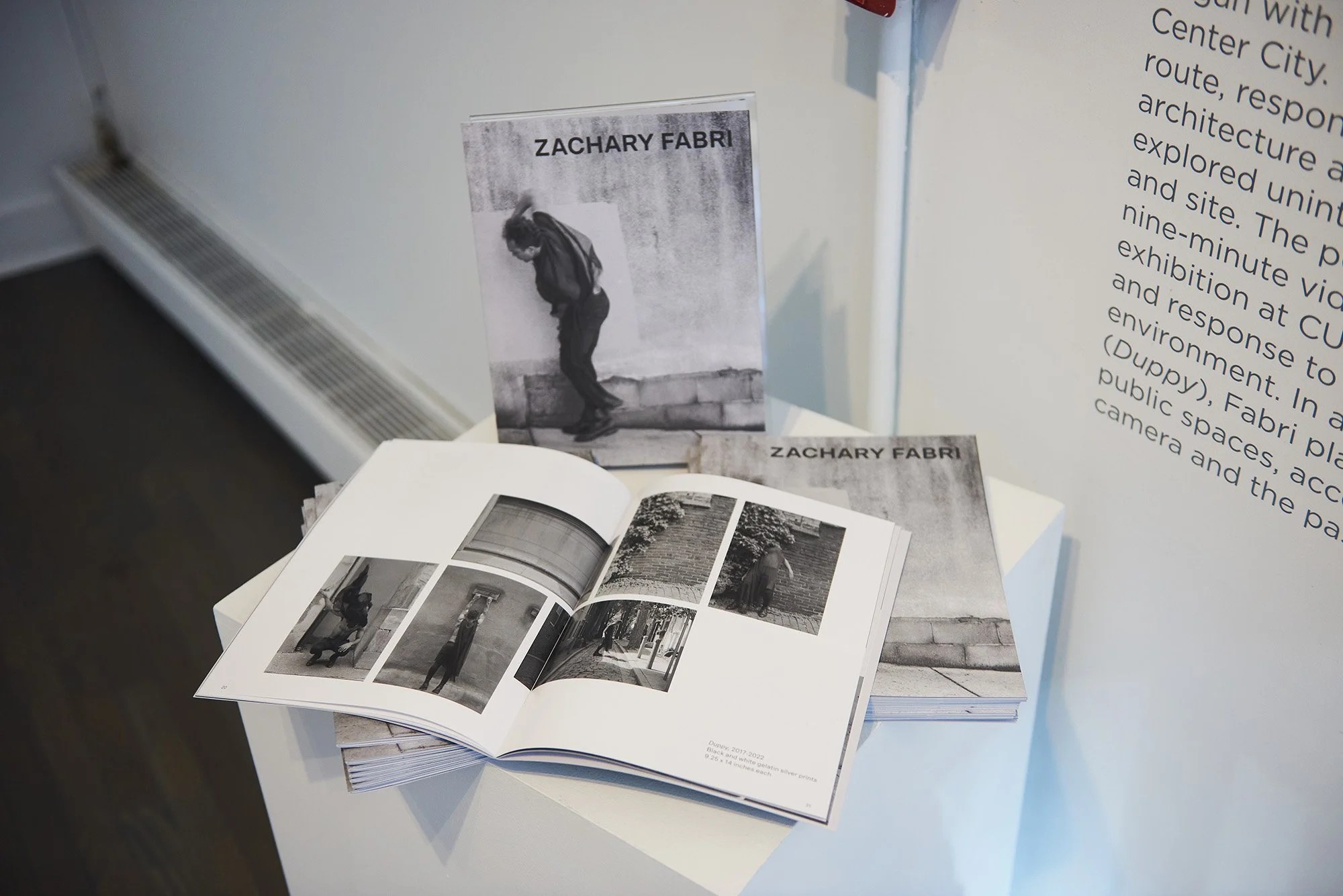 Initially conceived of as a site-specific performance commissioned for the Barnes Foundation, Mourning Stutter began with a series of actions throughout Philadelphia’s Center City. These actions, performed along a predetermined route, responded to and were choreographed by the architecture and urban design of each location, as Fabri explored unintentional spatial relationships between body and site. The performance is adapted by the artist into a nine-minute video (Mourning Stutter) presented as part of this exhibition at CUE, with a score that serves as an active call and response to Fabri’s movements within this architectural environment. In a series of black and white photographs (Duppy), Fabri plays with the spectacle of his body in these public spaces, accentuating his presence and absence for the camera and the passerby.